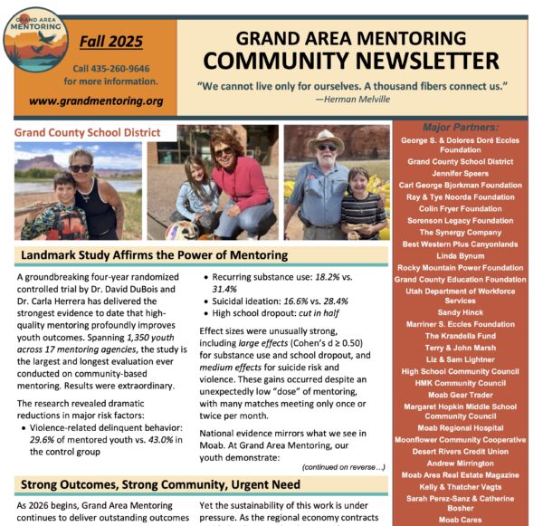 “In a world short on belonging, mentoring delivers.” This year’s data in both Moab and across the nation point to the same reality: when youth have a trusted adult who shows up for them consistently, their lives change—not just for a season, but for years to come.
